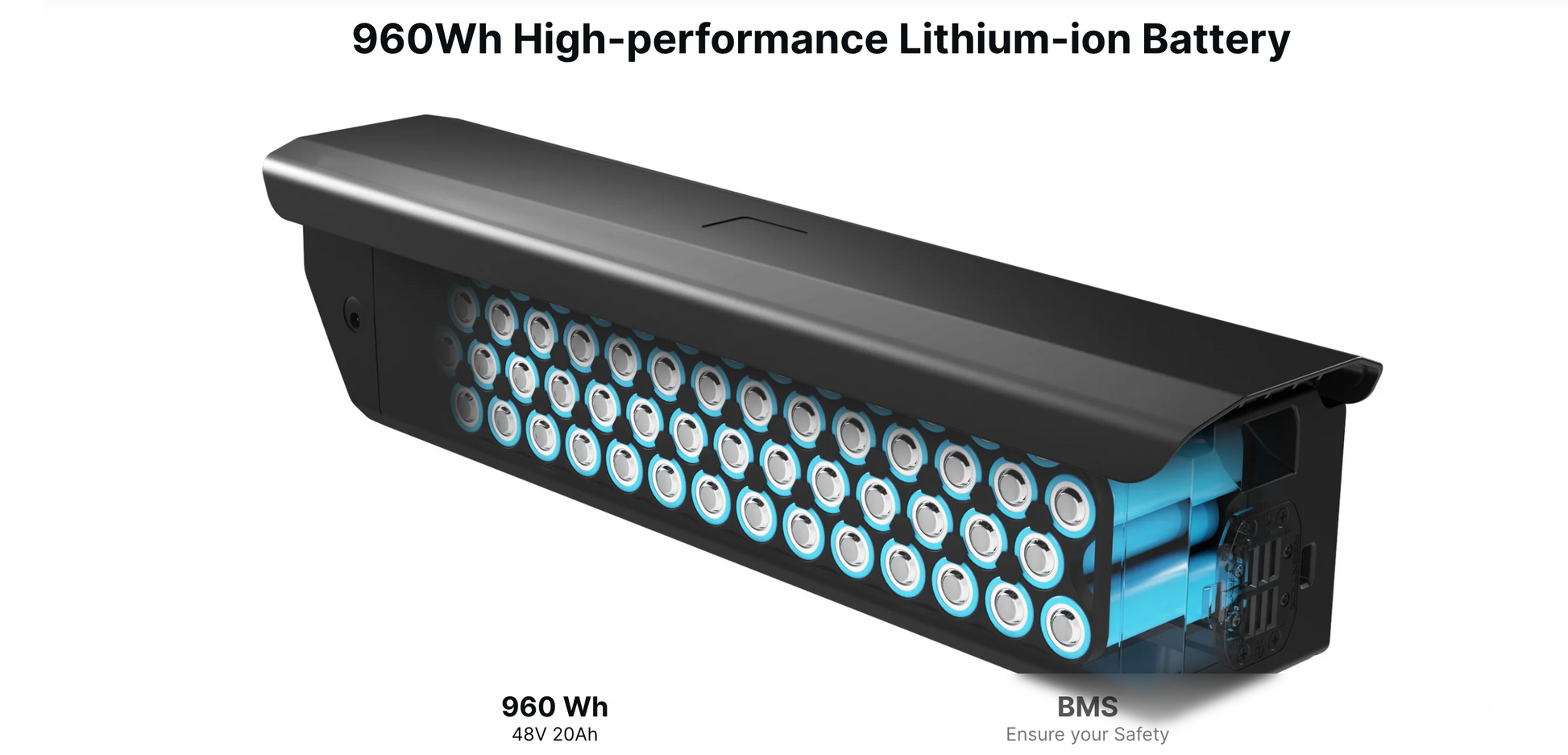 Himiway Zebra combines the new 48V 20AH Samsung/LG battery technology with a 5000mAh single cell capacity in a smaller size but larger diversity. Compared with 3500mAh cells made of nickel, cobalt and manganese, this 960Wh battery efficiently improves the range, stability and safety of Himiway bikes. A single charge can last up to 60 miles on pure electric power and over 80+ miles with pedal-assist. The battery will maintain 80% capacity after 1000 charges.