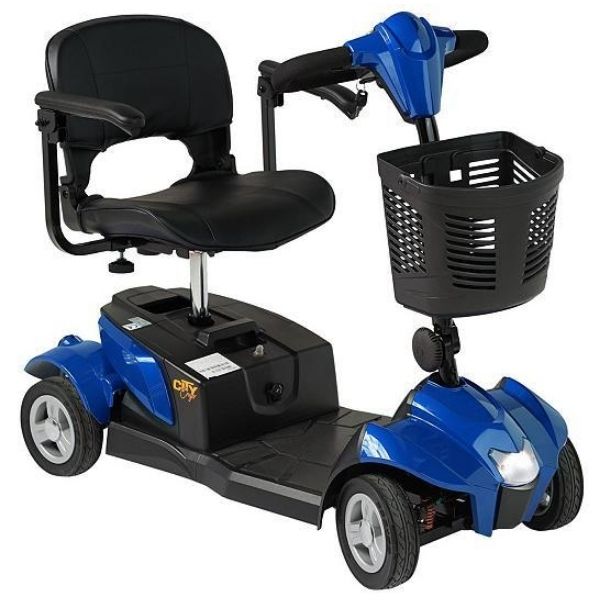 The CityCruzer scooter is a transportable scooter on the market with full suspension. The CityCruzer has the stability of a 4-wheel scooter with the turning radius of a 3-wheeler, providing the customer with greater maneuverability. It is the only small, disassembling scooter available with a mono-shock suspension and a standard size (not mini) transaxle. With a 285 lb load capacity and 4 wheels, the CityCruzer can transport higher weighted individuals with stability not usually found in portable scooters. The folding mobility seat has deep cushions and armrests that flip up and/or can be adjusted laterally.
